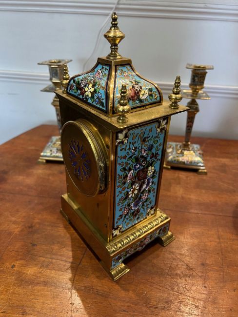 A LATE 19TH CENTURY FRENCH CHAMPLEVE ENAMEL CLOCK GARNITUREthe gilt bronze mantel clock decorated throughout with champleve enamel work, the gilt dial with Roman numerals, the twin train movement striking on a gong, stamped Vincenti, 1855, together with a pair of matching candlesticks,the clock 29cm high, (3)The clock is in working order and recently serviced.