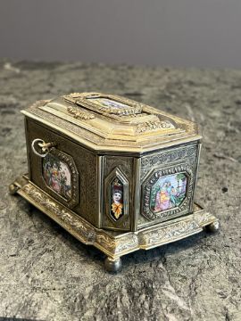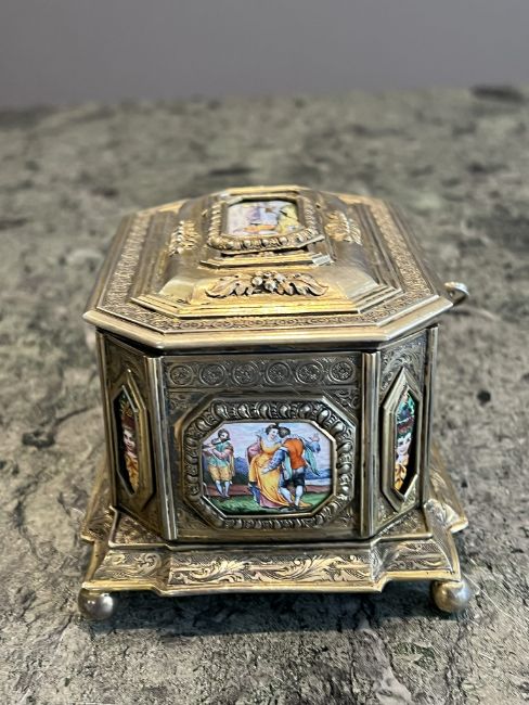 A LATE 19TH CENTURY GERMAN SILVER GILT AND ENAMEL MOUNTED CASKETin the Renaissance Revival style, the small jewellery box of rectangular form with canted angles, on a plinth base and ball feet, with chased decoration throughout including borders of acanthus leaves, the hinged top with an enamelled panel depciting a hunting scene with a stag and hounds, the sides, front and back with further enamelled panels depicting various 16th century scenes and figures, the interior lined with red velvet, the underside with German marks, with key,530g overall 14cm wide