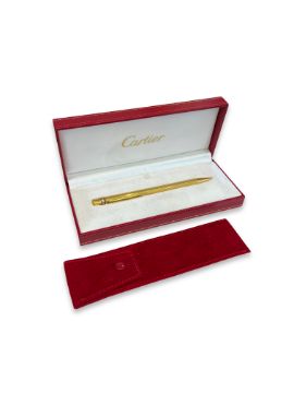 CARTIER: A GOLD PLATED PEN IN DISPLAY BOXthe pen marked 'CARTIER', in Cartier box with suede cover,the pen 13.7cm in length