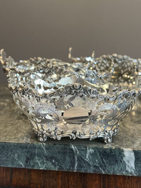 AN IMPRESSIVE SUITE OF SEVEN STERLING SILVER SERVING BASKETS, EARLY 20TH CENTURYthe antique set of Victorian / Edwardian fruit or serving bowls in the Rococo Revival style, of graduated sizes, with a large fruit basket, all of matching form with pierced bodies richly engraved with roses and other flowers, scrollwork and cartouches, date letters from 1898 to 1904, London, maker's mark for Charles Stuart Harris, 4700g overall (151.10 oz.t.)the largest 24cm wide x 16.5cm high (7)Good condition.