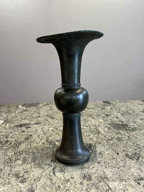 A CHINESE BRONZE TRUMPET VASEQing dynasty, brown patinated, with everted rim and circular beaded foot, unmarked,27cm high